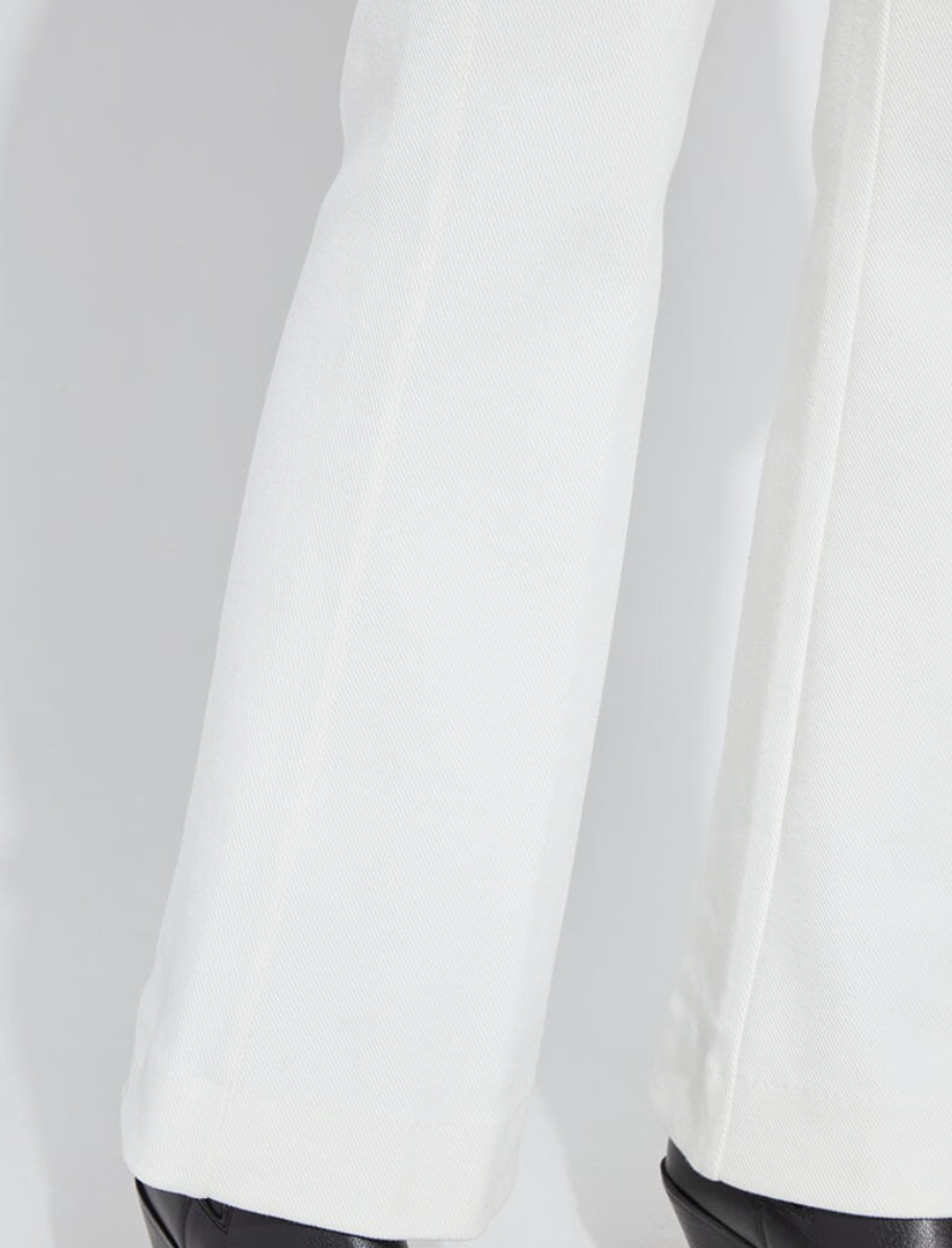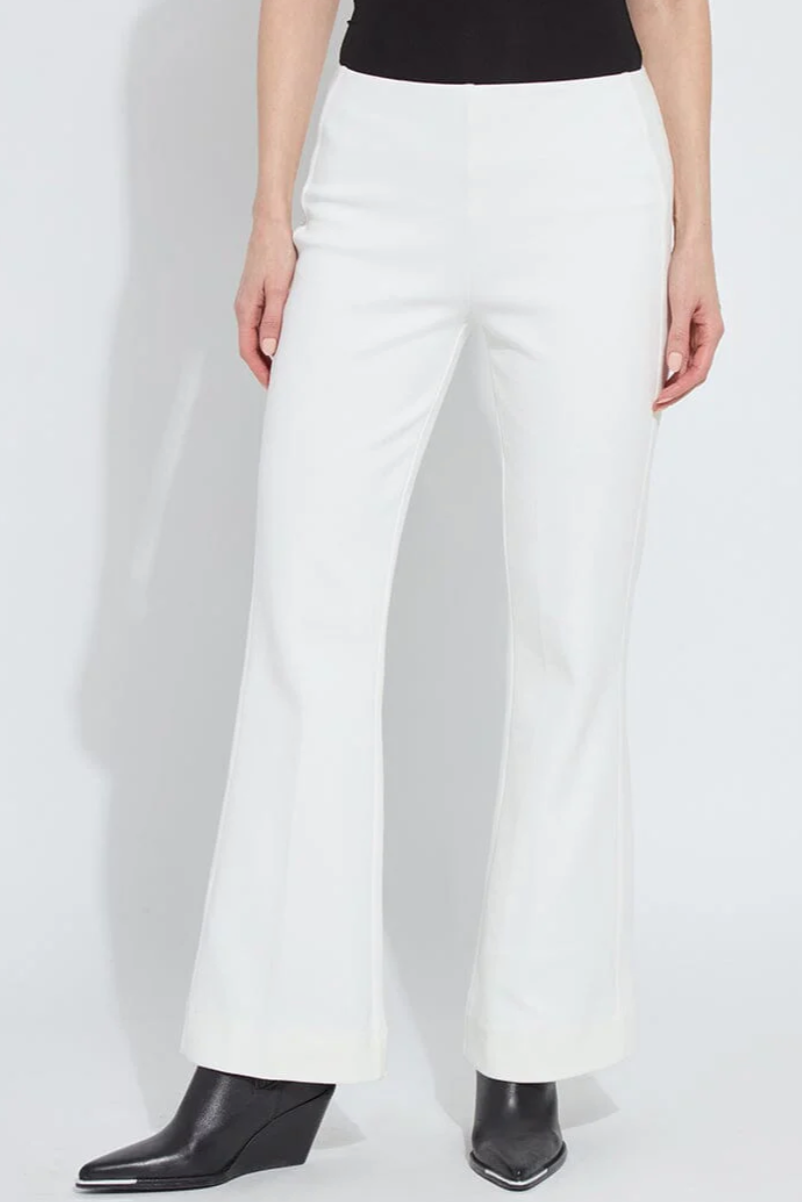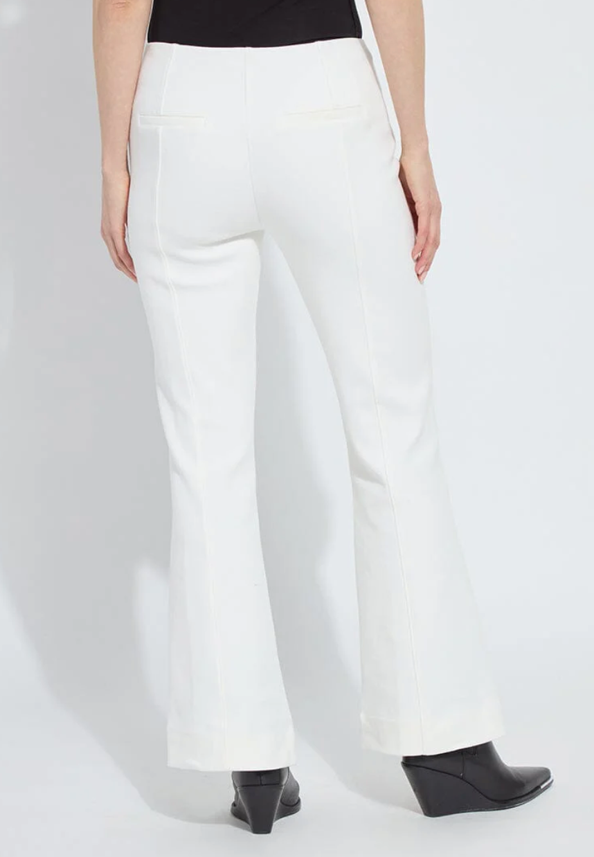 The Alma Hi Waist Cavalry Trouser offers a clean front, concealed patented waistband, center back seams and back faux welt pockets. The side seams are shifted to the front to create an elongated, slim fit. Made from 4-way Stretch Cavalry Twill, the Alma Hi Waist Trouser is fitted at the waist, skims the hips and thighs and opens into a flared hem. Style with the Daiane Utility Scarf Blouse and blush kitten heels.