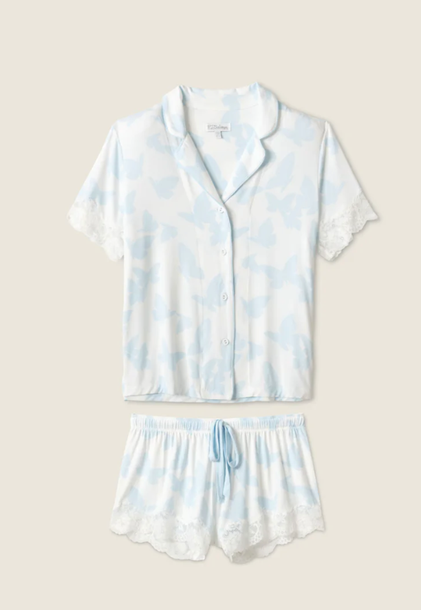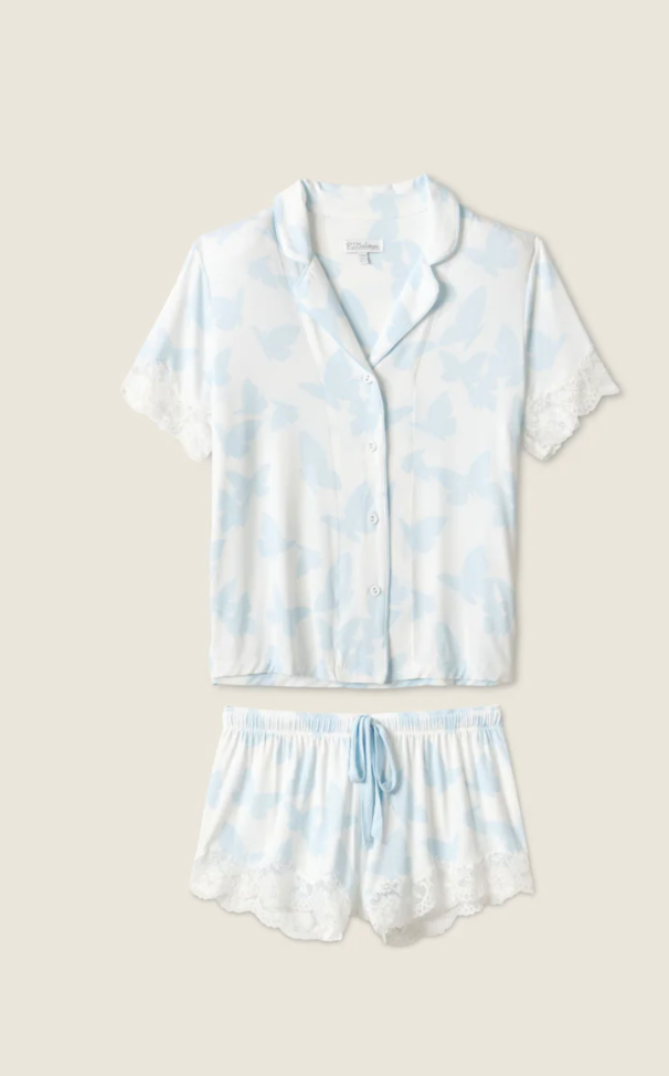 Flutter into relaxation with this dreamy butterfly-printed pajama set, crafted from ultra-soft modal jersey. Featuring a button-front short-sleeve top and tie-waist shorts with lace-trimmed hems, this coordinating set offers ultimate comfort with a touch of whimsy. As part of PJ Salvage Bridal Collection, the delicate blue butterfly print makes it the perfect "something blue" for brides, and equally fitting for springtime lounging.