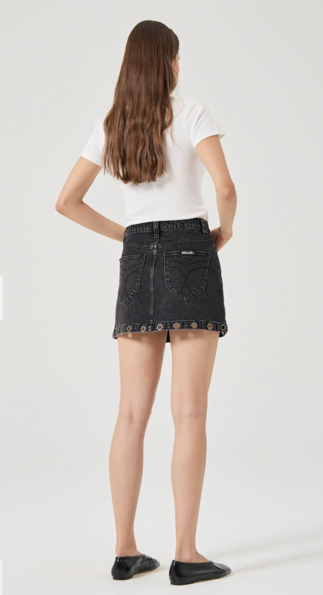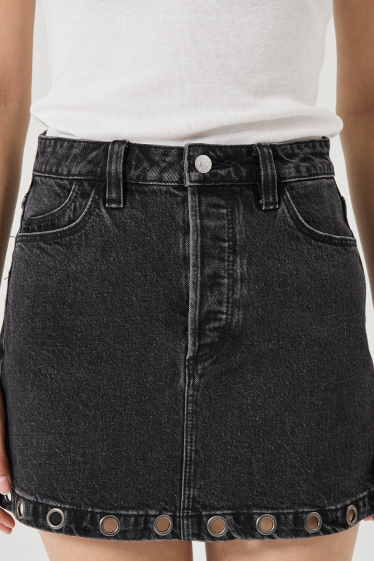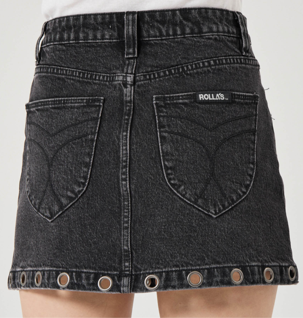 • Washed black vintage look with a worn-in, edgy finish and eyelet detailing around the hem