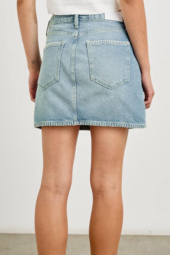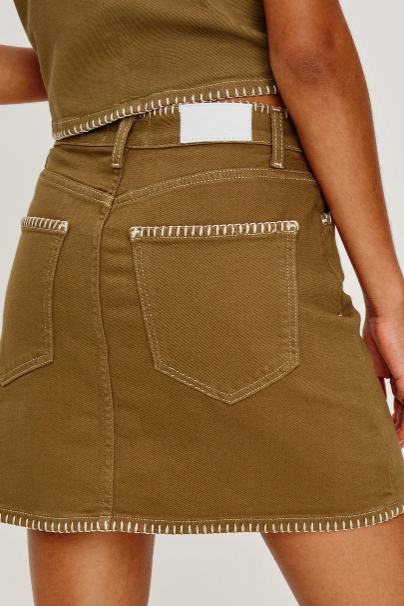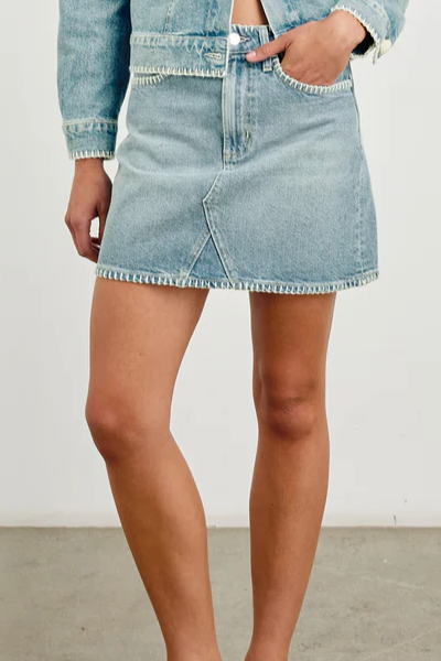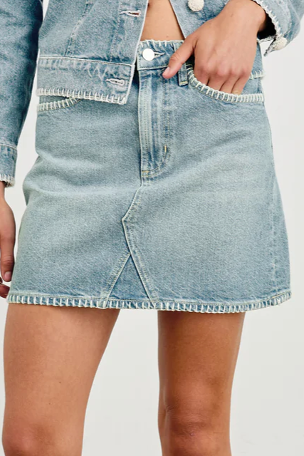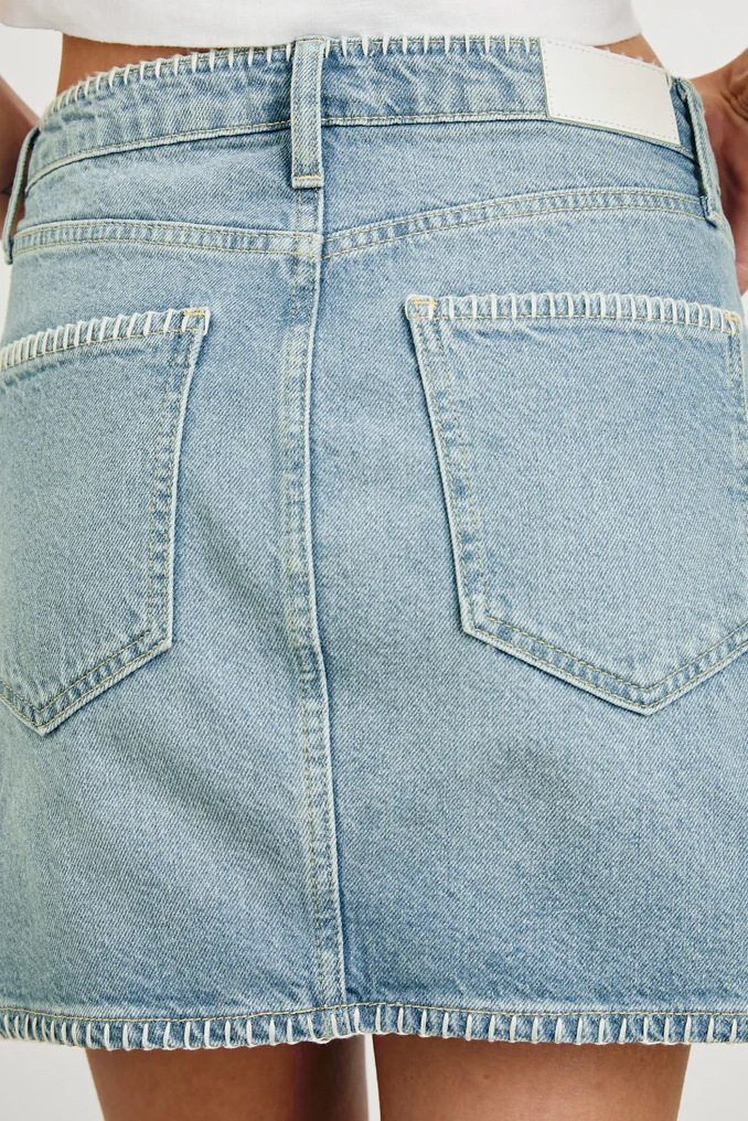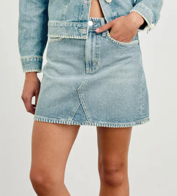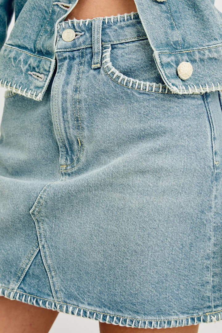 Inspired by 'It' girls of the 90s, the Laurel is a high-rise mini with a fitted waist, zipper fly, and A-line shape. Complete with a contrast white blanket stitch in a 100% cotton fabrication, this skirt is an instant classic.