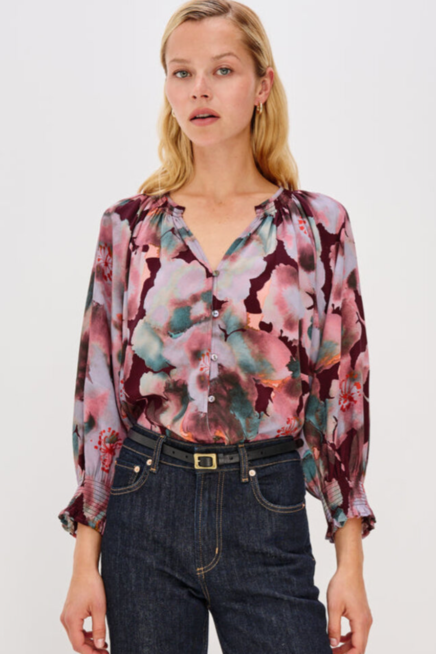 An ultra-soft rayon crepe blouse designed to keep you comforable. The Mariah features three-quarter sleeves with shirred cuffs, a roomy fit and natural shell buttons.
