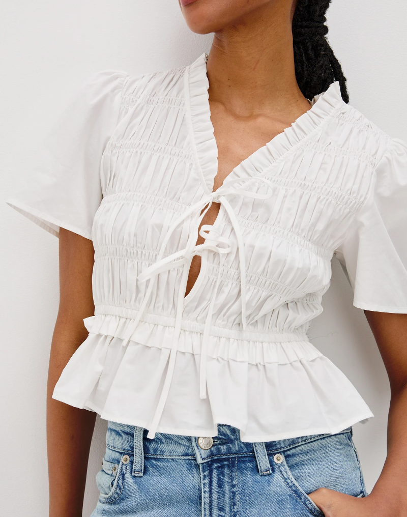 The Portia is a structured peplum top crafted from heavy cotton poplin. Front ties serve as adjustable closures for the plunging neckline, while delicate ruffle details complete the look.