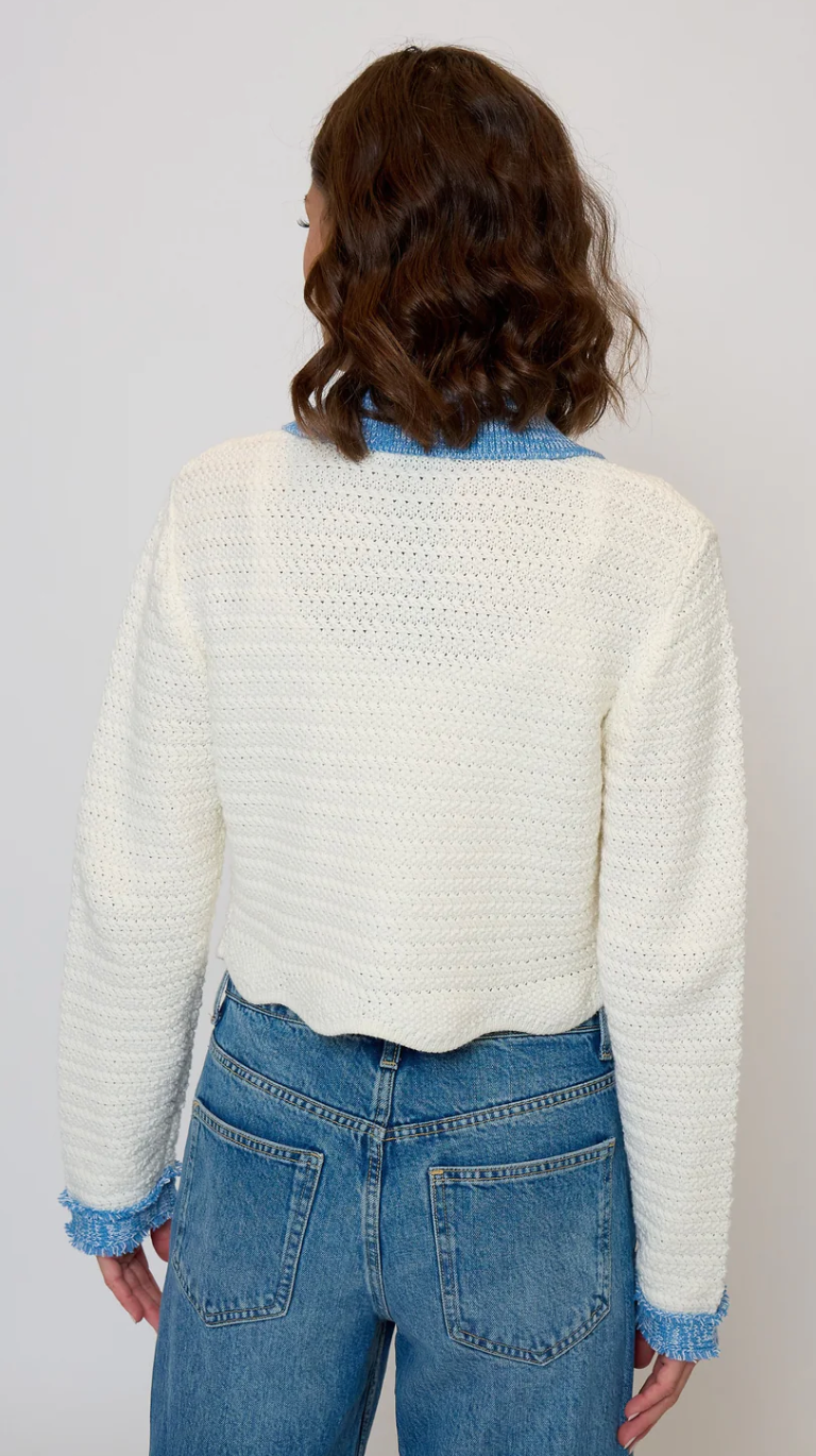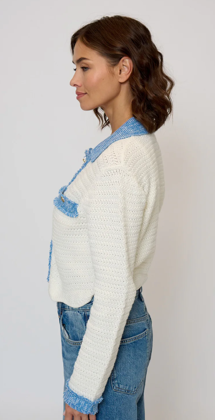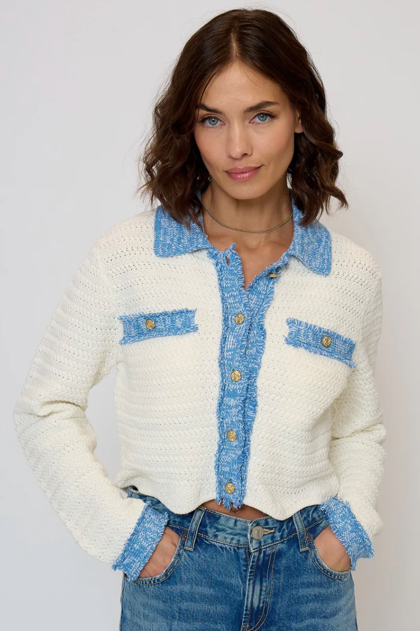 • Cozy cardigan with soft textured knit and distinctive contrasting trim along the edges.