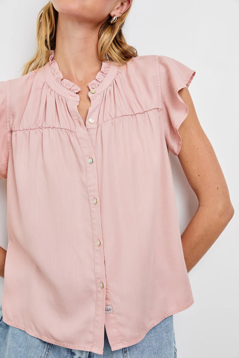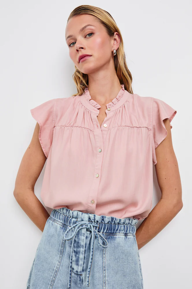 The Ruthie romanticizes a staple with ultra-feminine details. Made from Tencel™ denim, this crisp white button-down shirt features a banded collar, soft shirring at front yoke, and cap sleeves with flounce detail.