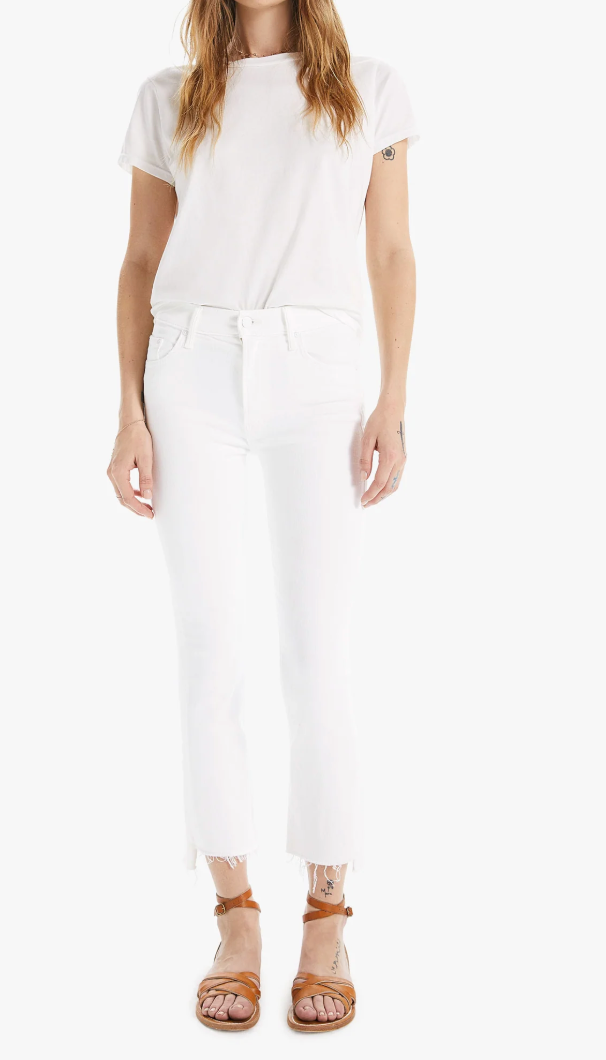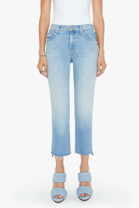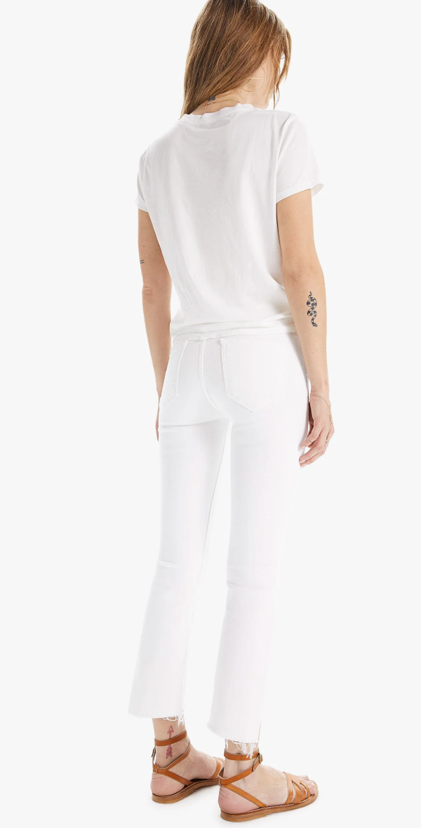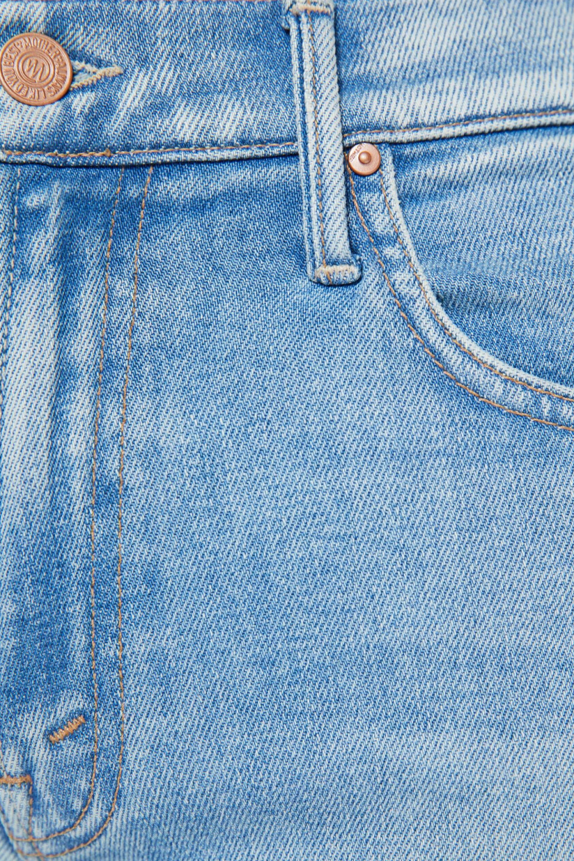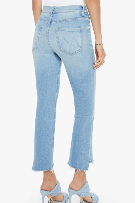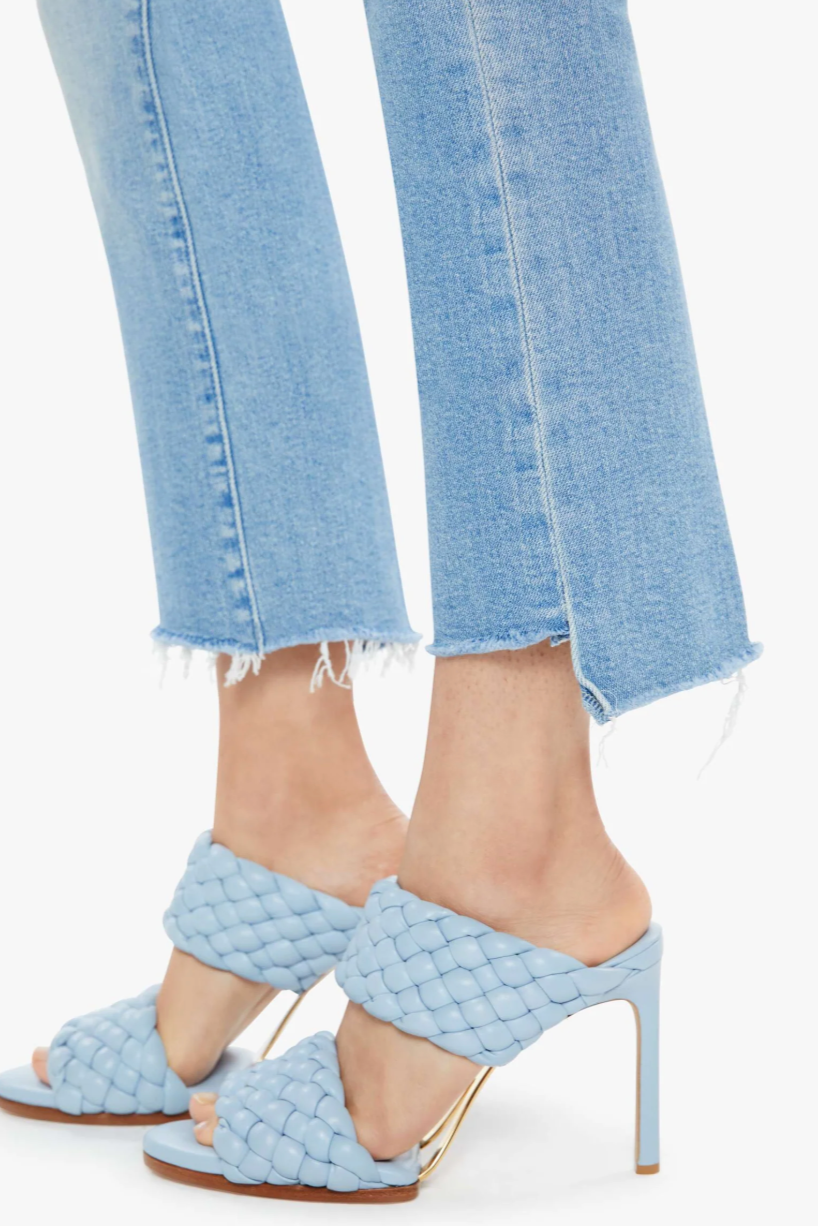 High-waisted bootcut is cropped at the ankle with a frayed step-hem. Cut from stretch denim, Off Limits is a dark blue wash with whiskering and fading at the knees.