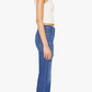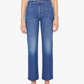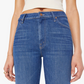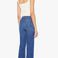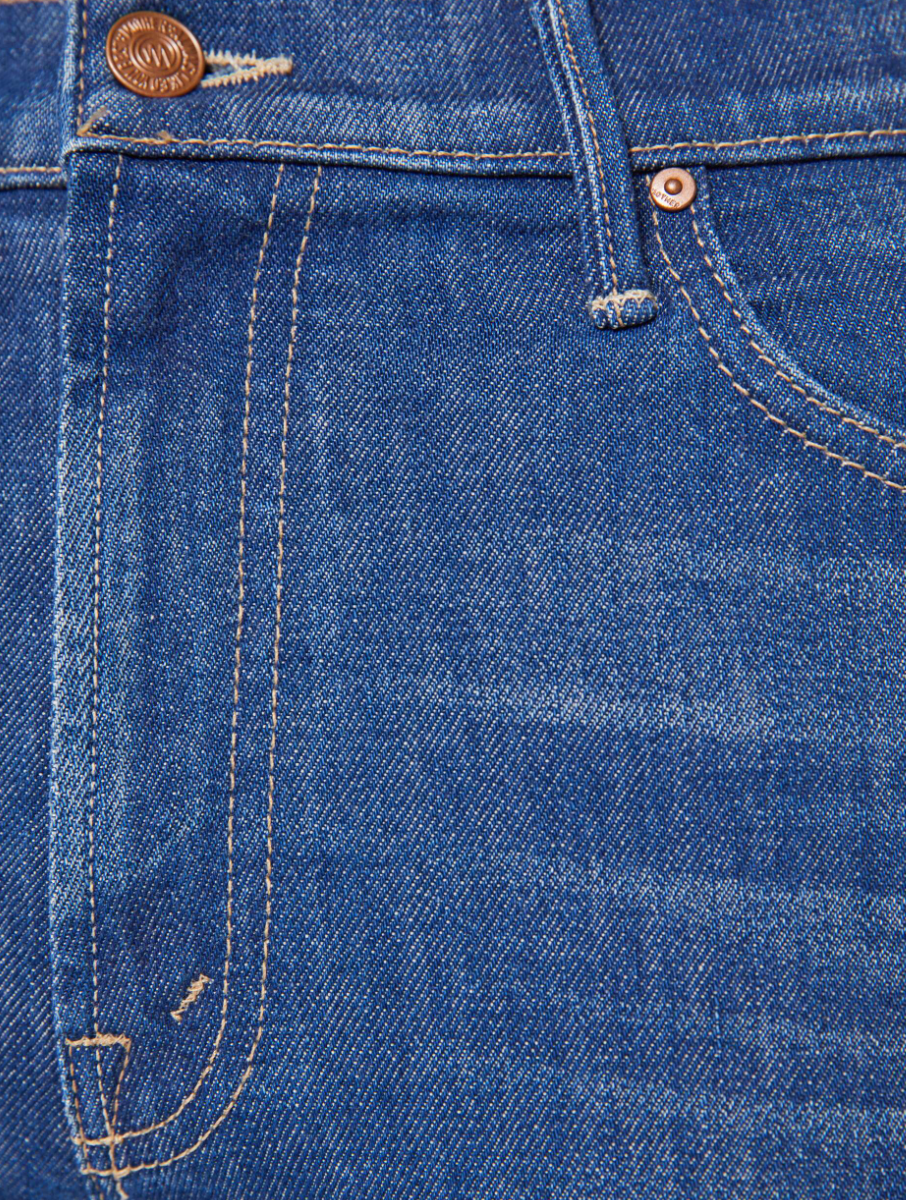 A high-rise straight leg jean with a zip fly, 28.25-inch inseam and a clean hem. Made from denim with a touch of stretch, Do Not Disturb is a mid-blue with whiskering and fading at the knee.