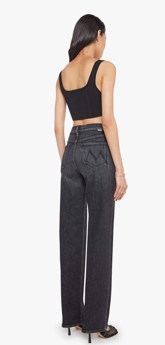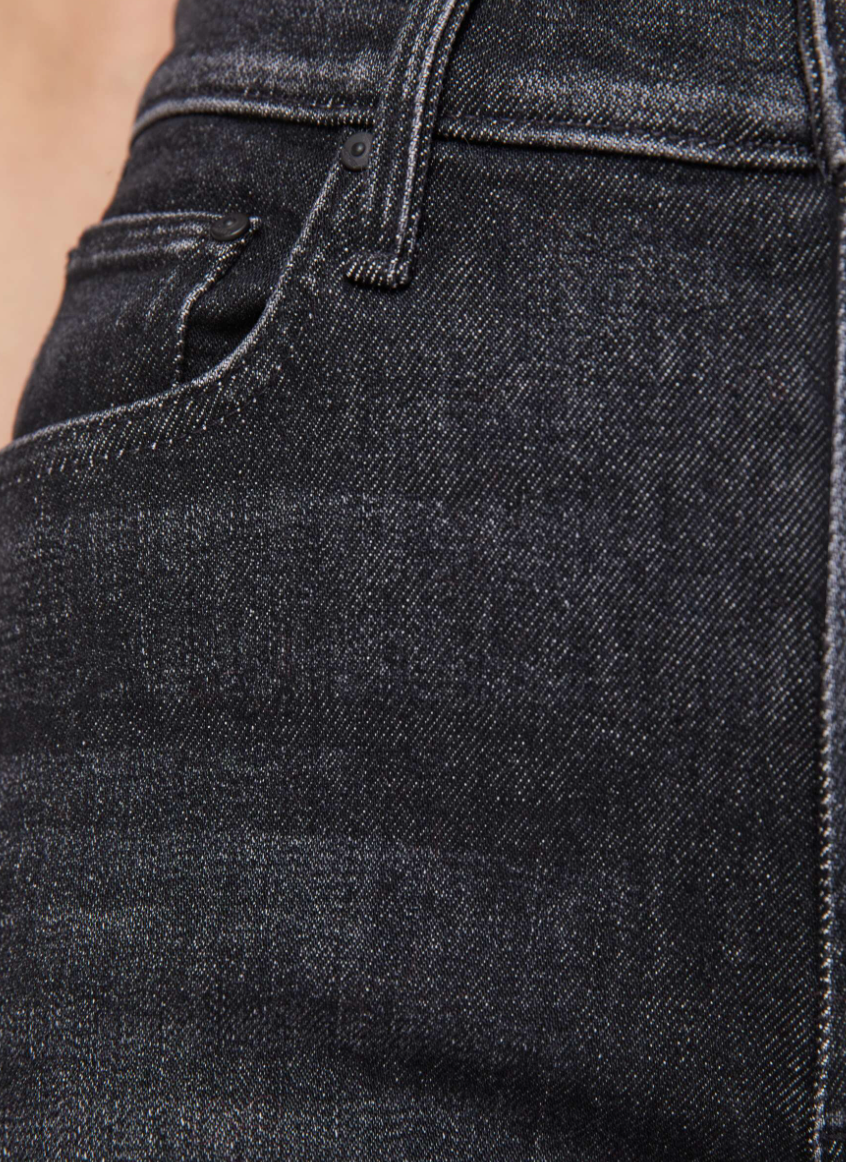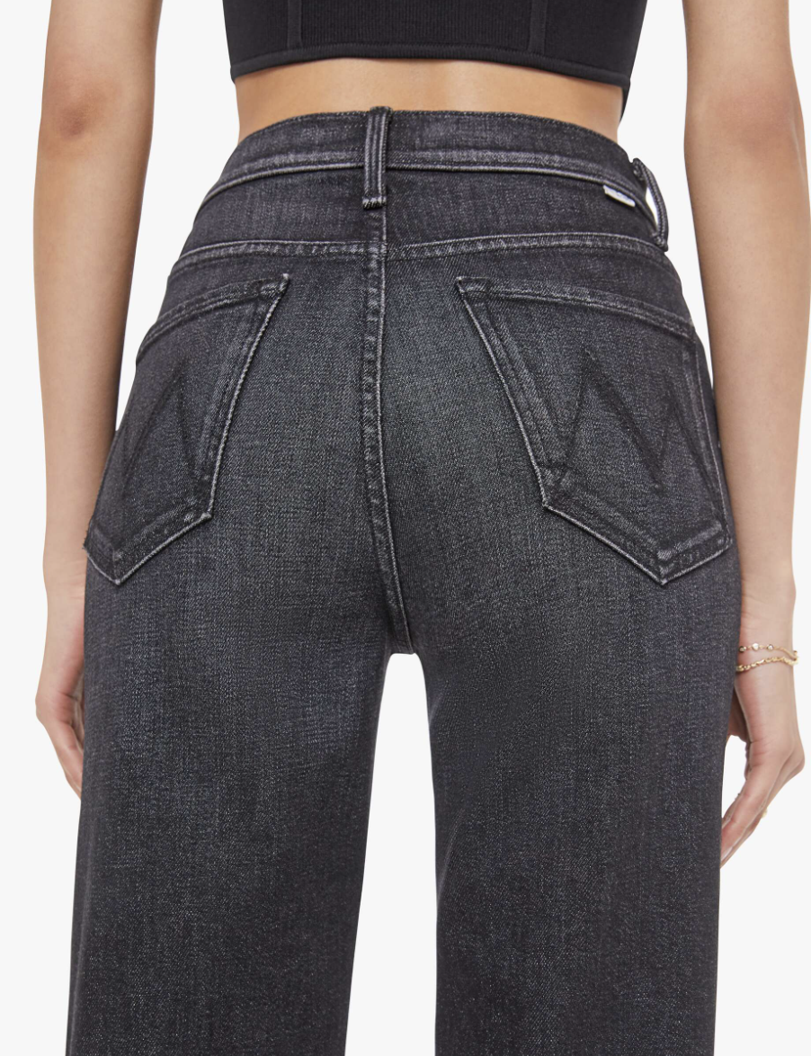 A cut above. High-waisted jeans with a wide straight leg, zip fly and a long 34-inch inseam with a clean hem. Cut from a blend of recycled stretch denim, Keep It Sharp is a washed black with subtle whiskering, fading and tonal hardware.