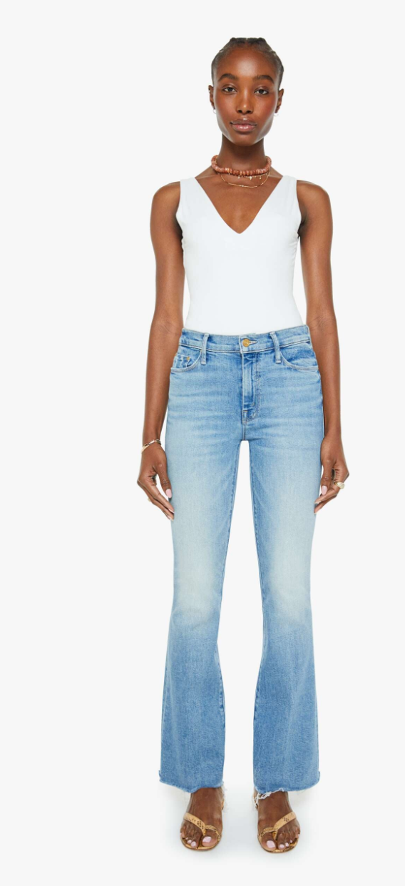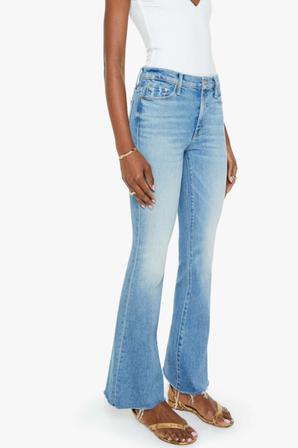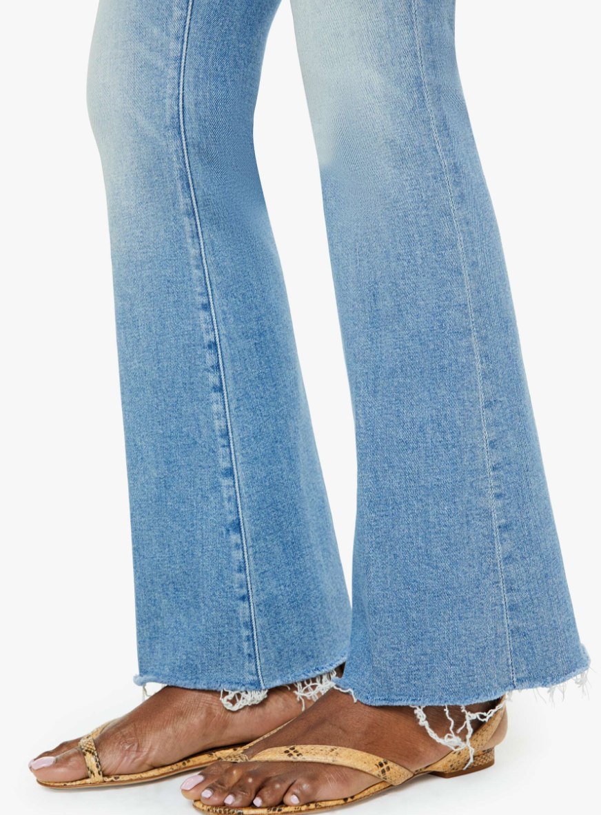Sunkissed. the most popular mid-rise flare has a 31-inch inseam with a frayed hem. Cut from stretch denim, Glow Up is a light blue with whiskering and fading.